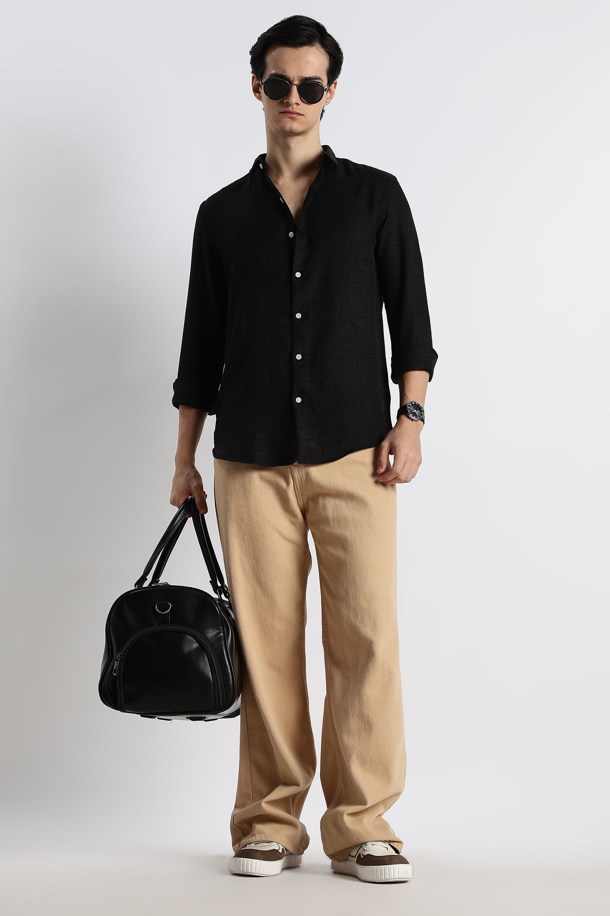 Crafted from a smooth polyester-linen blend, this Black shirt brings together the structure of linen and the comfort of poly — giving you a lightweight, breathable feel with a gently textured finish.