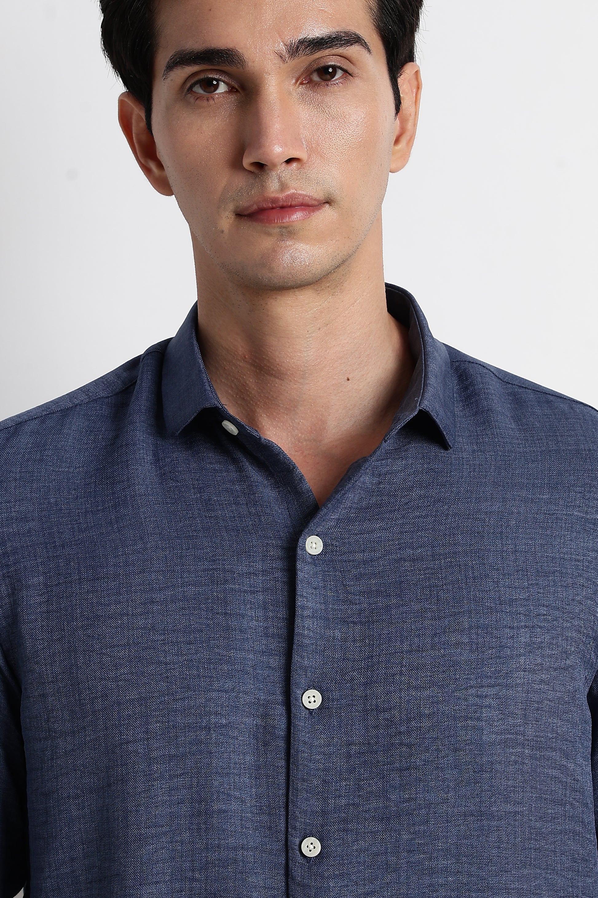 Crafted from a smooth polyester-linen blend, this Blue shirt brings together the structure of linen and the comfort of poly — giving you a lightweight, breathable feel with a gently textured finish.