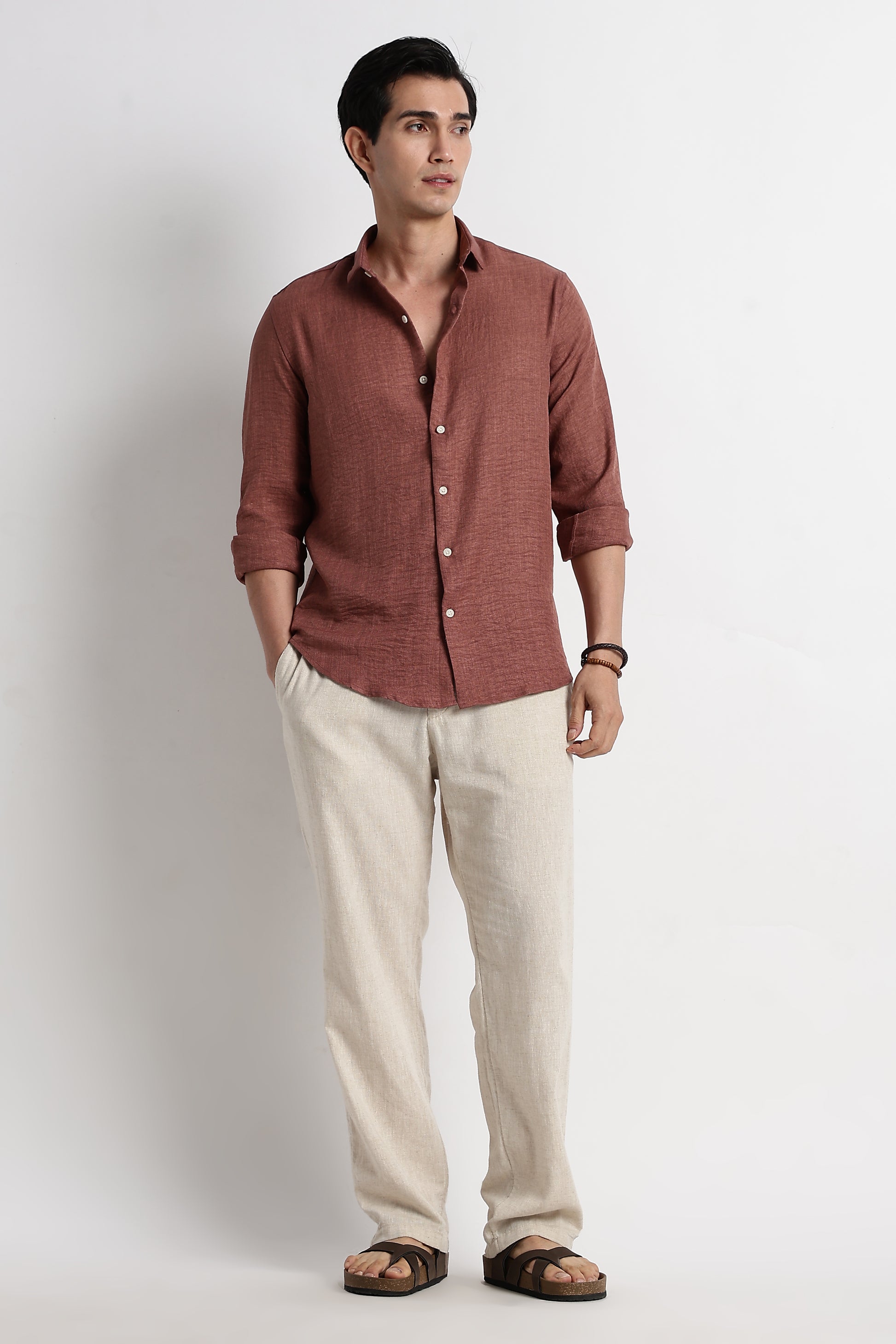 Crafted from a smooth polyester-linen blend, this Brown shirt brings together the structure of linen and the comfort of poly — giving you a lightweight, breathable feel with a gently textured finish.