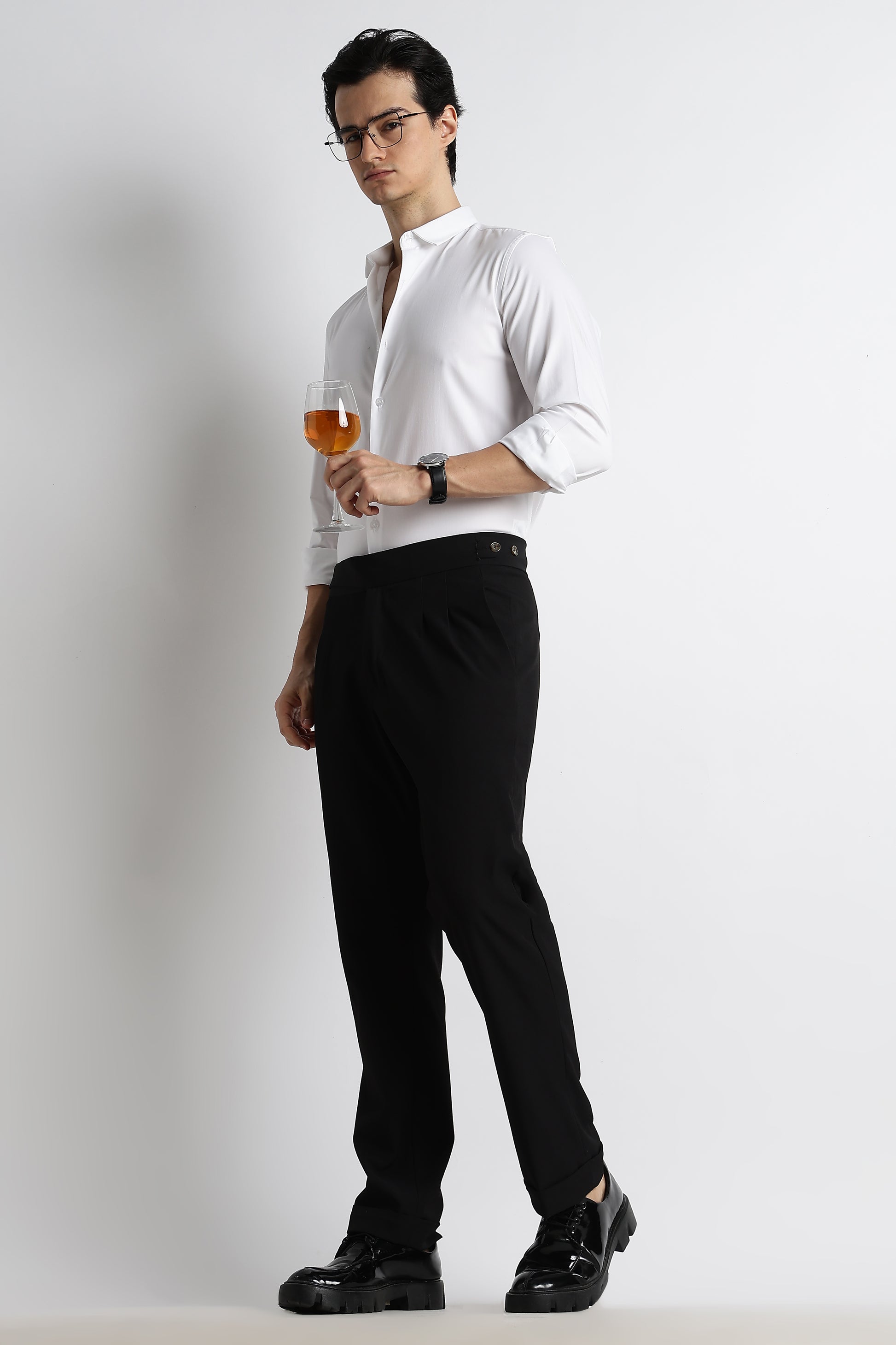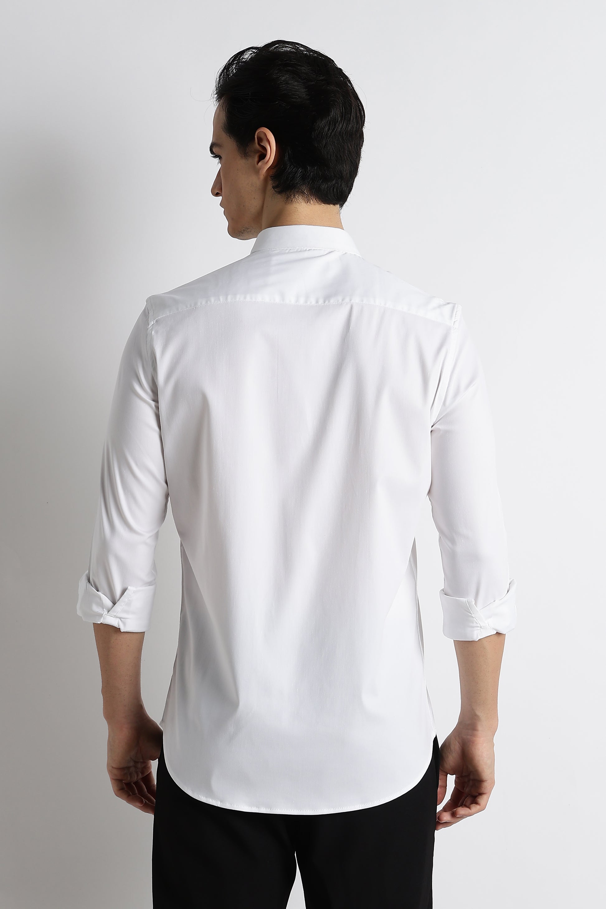 This White poly-lycra shirt blends a refined silhouette with everyday flexibility. Designed to move with you, it offers a clean, structured look without compromising on comfort. The slim fit flatters your frame, while the smooth fabric finish gives it a modern, understated edge — perfect from work hours to after-hours.