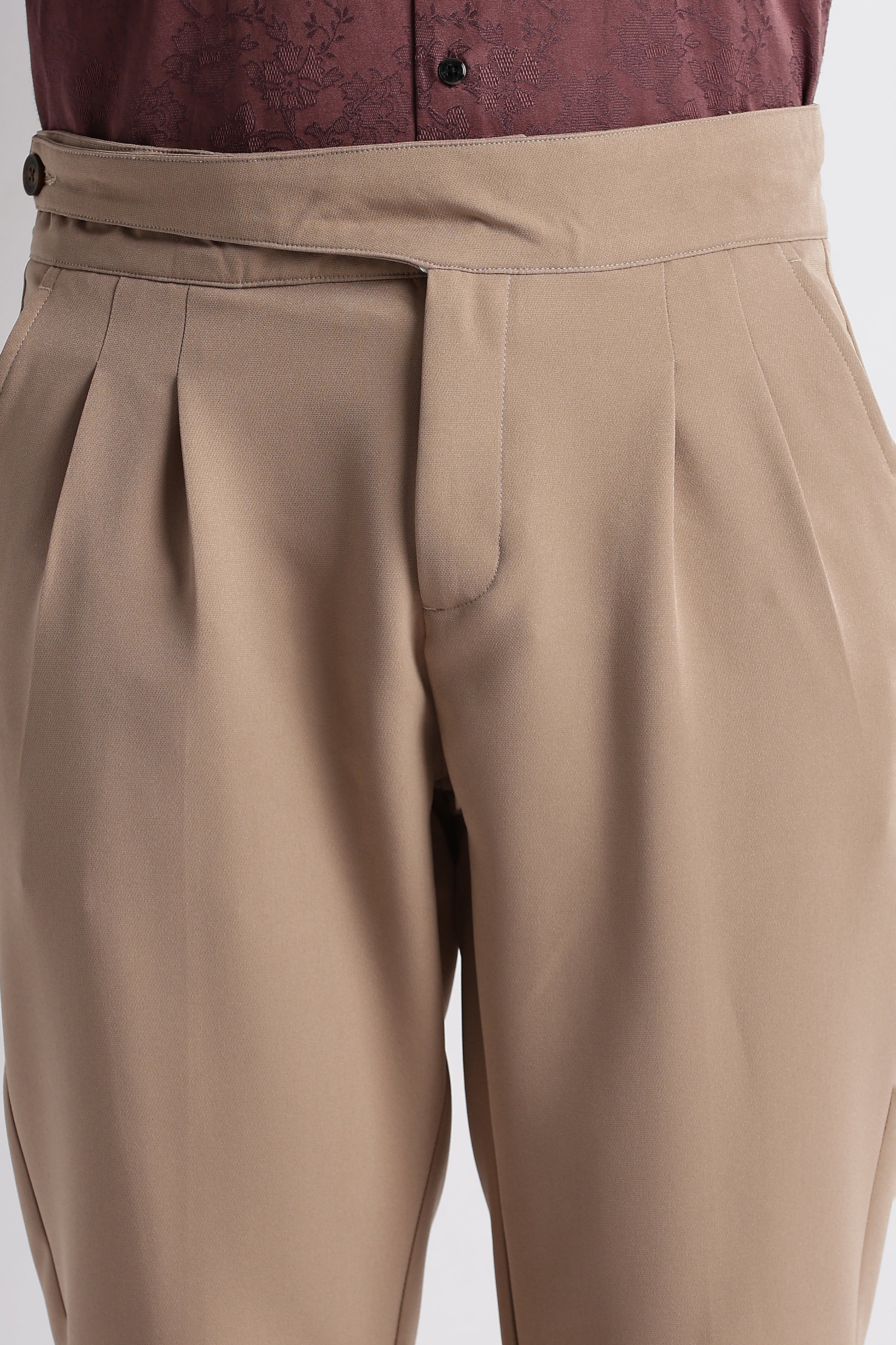 Inspired by timeless military tailoring, these beige Gurkha trousers bring structure and sophistication to casual dressing. Crafted from smooth poly fabric, they hold their shape while offering all-day comfort. The signature high-waist Gurkha closure and pleated front add a touch of old-world charm — redefined for the modern man. Perfect for those who appreciate understated design with a tailored edge.