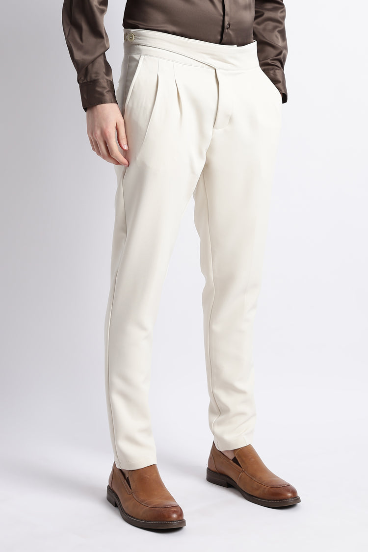 Inspired by timeless military tailoring, these beige Gurkha trousers bring structure and sophistication to casual dressing. Crafted from smooth poly fabric, they hold their shape while offering all-day comfort. The signature high-waist Gurkha closure and pleated front add a touch of old-world charm — redefined for the modern man. Perfect for those who appreciate understated design with a tailored edge.